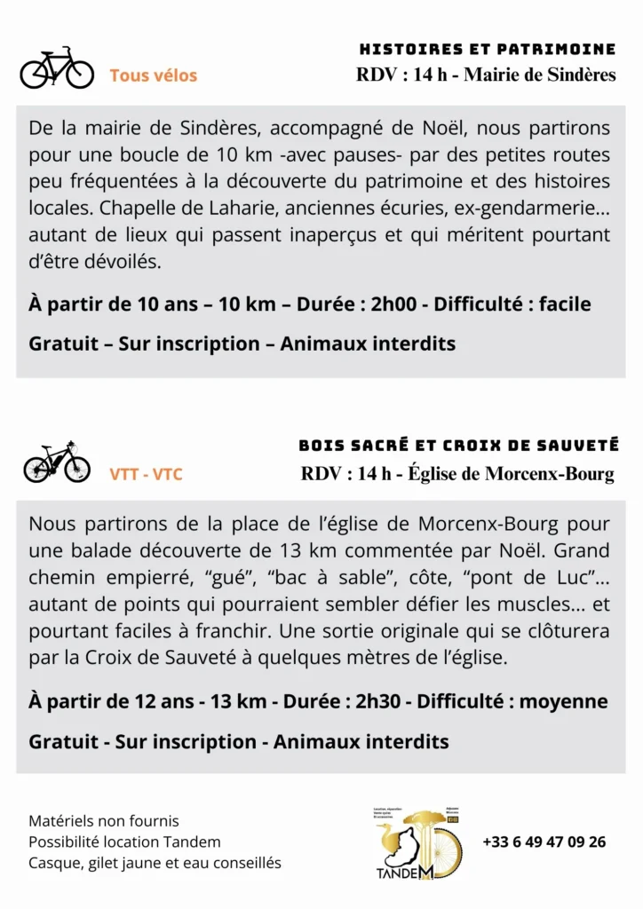 Matériels non fournis – Possibilité location Tandem – Casque, gilet, eau conseillés