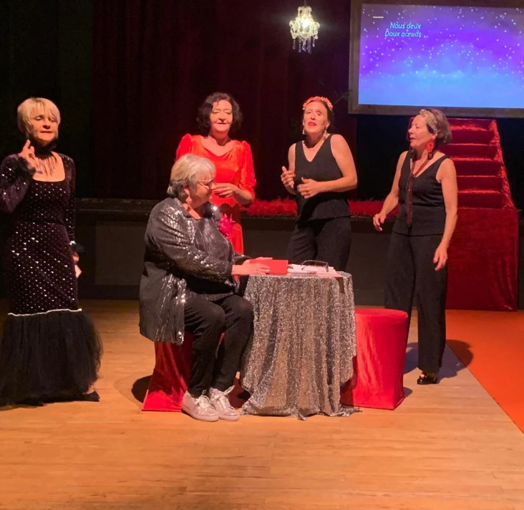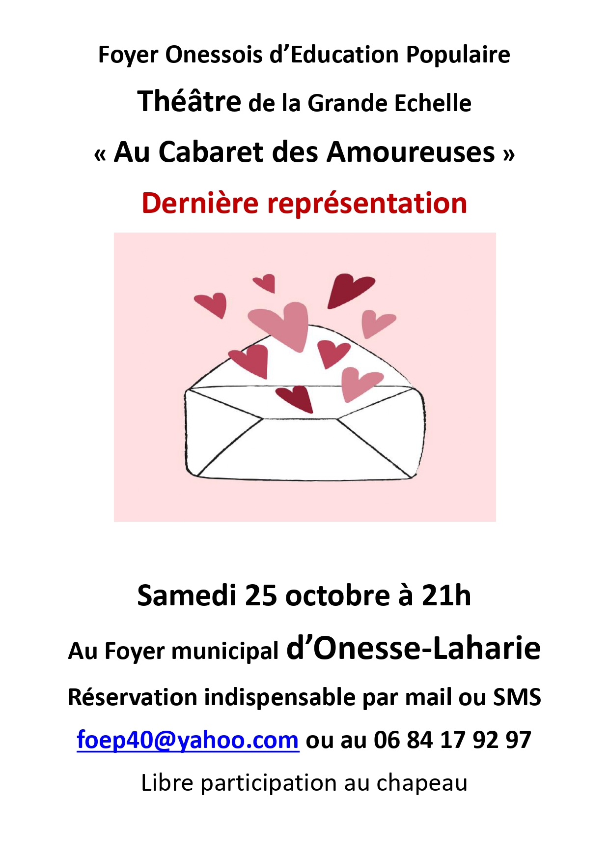 Le Foyer Onessois d’Education Populaire présente sa dernière représentation de théâtre de la grande Echelle » Au cabaret des Amoureuses » avec des histoires d’amour touchantes ou drôles avec des lettres, des images, des chansons, des musiques et un décor de cabaret rouge et noir.