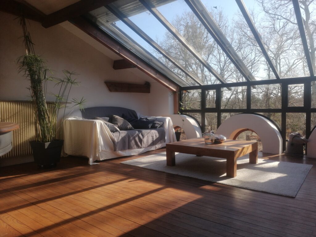 A l’étage, verrière avec vue imprenable sur la forêt et le ciel.